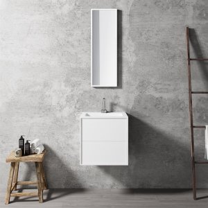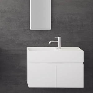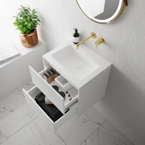 Vaskemøblet består af ren massiv mathvid SolidTec®, et solidt overfladeprodukt, som tåler vand og fugt, det egner sig derfor fortræffeligt til meget små badeværelser.